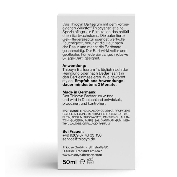 Das Thiocyn Bartserum 50ml mit dem körpereigenen Wirkstoff Thiocyanat ist die neu entwickelte Spezialpflege zur aktiven Stimulation des natürlichen Bartwachstums. Die patentierte Gel-Pflegerezeptur spendet wertvolle Feuchtigkeit, beruhigt die empfindliche Gesichtshaut nach der Rasur und macht die Barthaare geschmeidig. Der Bart wirkt deutlich voller, kräftiger und gepflegter.