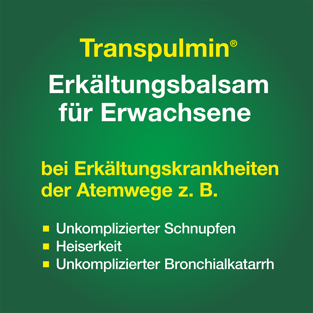 Transpulmin Erkältungsbalsam dient der äußeren Anwendung zur Verbesserung des Befindens bei Erkältungskrankheiten der Luftwege (wie unkomplizierter Schnupfen, Heiserkeit und unkomplizierter Bronchialkatarrh).