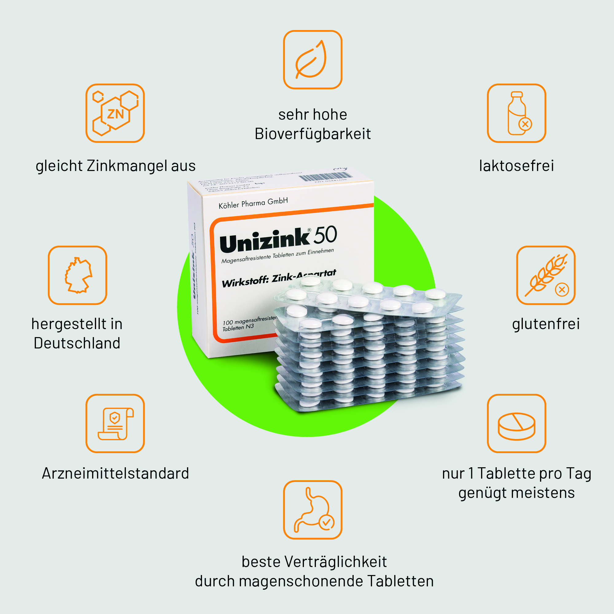 Unizink 50, magensaftresistente Tabletten.