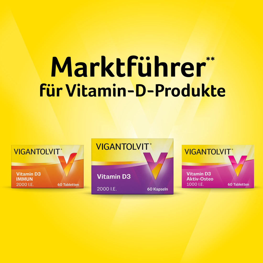 *Vitamin D, Vitamin C, Selen, Zink und Kupfer unterstützen das normale Funktionieren des Immunsystems. *Zudem trägt Vitamin D zum Erhalt gesunder Knochen und einer normalen Muskelfunktion bei. Zink, Selen und Kupfer schützen die Zellen vor oxidativem Stress. Vitamin C trägt zum Erhalt eines normalen Energiestoffwechsel bei. **Nicht verschreibungspflichtige Vitamin-D-Produkte, erhältlich in Apotheken. Insight Health; DatamedIQ, 10/2021. Verzehrempfehlung: Erwachsene nehmen täglich 1 Tablette mit Wasser zu einer Mahlzeit ein. Wichtig: Die empfohlene tägliche Dosis darf nicht überschritten werden. Es sollten parallel keine anderen Nahrungsergänzungsmittel oder Medikamente, die Vitamin D, Vitamin C, Zink, Selen oder Kupfer enthalten, eingenommen werden. Menschen mit Nierenproblemen, erhöhtem Kalziumspiegel (Blut oder Urin) oder einer Neigung zur Bildung von Nierensteinen sollten mit ihrem Arzt sprechen, bevor sie Vitamin-D-Präparate einnehmen. VIGANTOLVIT® IMMUN ist ein Nahrungsergänzungsmittel für Erwachsene. Nahrungsergänzungsmittel sind kein Ersatz für eine ausgewogene, abwechslungsreiche Ernährung und eine gesunde Lebensweise. - Für Kinder unzugänglich lagern. - Trocken lagern. - Nicht bei Temperaturen von über 25 °C lagern. - Weitere Informationen finden Sie unter www.vigantolvit.de